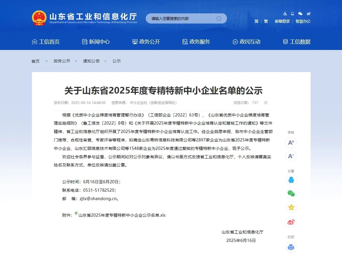 近日,山东省工业和信息化厅正式公布了山东省2025年度“专精特新”中小企业名单,梯联网科技公司凭借卓越的技术实力、创新能力和发展潜力,在众多企业中脱颖而出,成功荣誉上榜!
